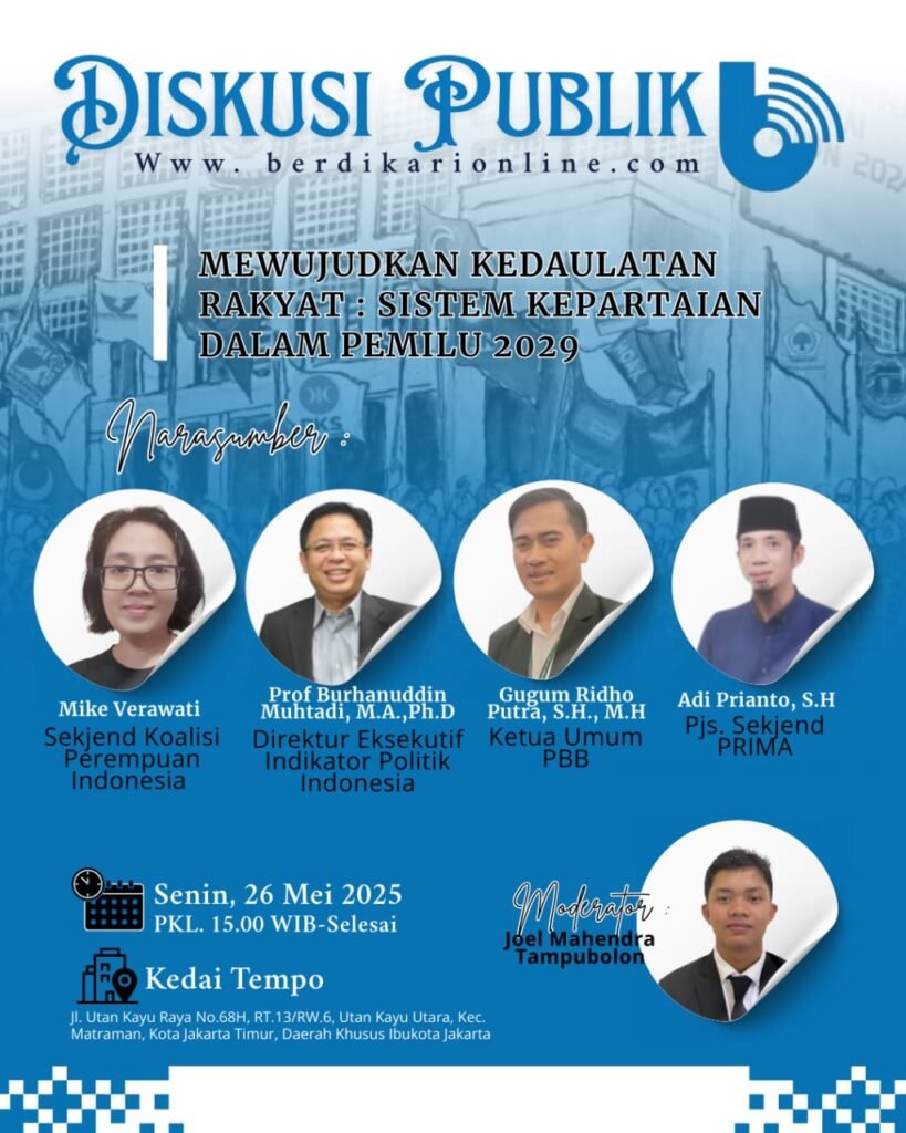 Berdikari online akan melaksanakan diskusi publik dengan tema “Wujudkan kedaulatan rakyat: sistem kepartaian dalam pemilu 2029”